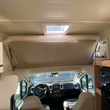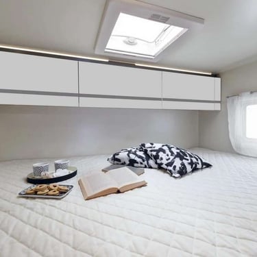 Panoraminis langas keleiviams. Alkovos lova patogiai vienu judesiu užverčiama, taip kemperyje dienos metu daugiau erdvės.